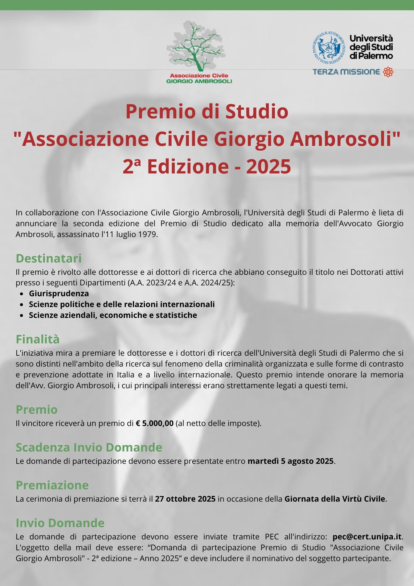 L’Università degli Studi di Palermo è orgogliosa di promuovere, insieme all’Associazione Civile Giorgio Ambrosoli, la seconda edizione del Premio di studio alla memoria dell’Avv. Giorgio Ambrosoli (Bando), un riconoscimento di € 5.000 destinato a dottori e dottoresse di ricerca dell’Ateneo che abbiano dedicato la propria tesi allo studio dei fenomeni di illegalità organizzata e delle sue forme di contrasto e prevenzione, in Italia e all’estero.